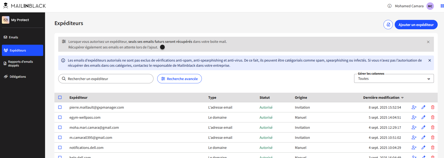 Votre expéditeur ou domaine est maintenant ajouté et MAILINBLACK appliquera automatiquement vos règles (autorisé ou bloqué)