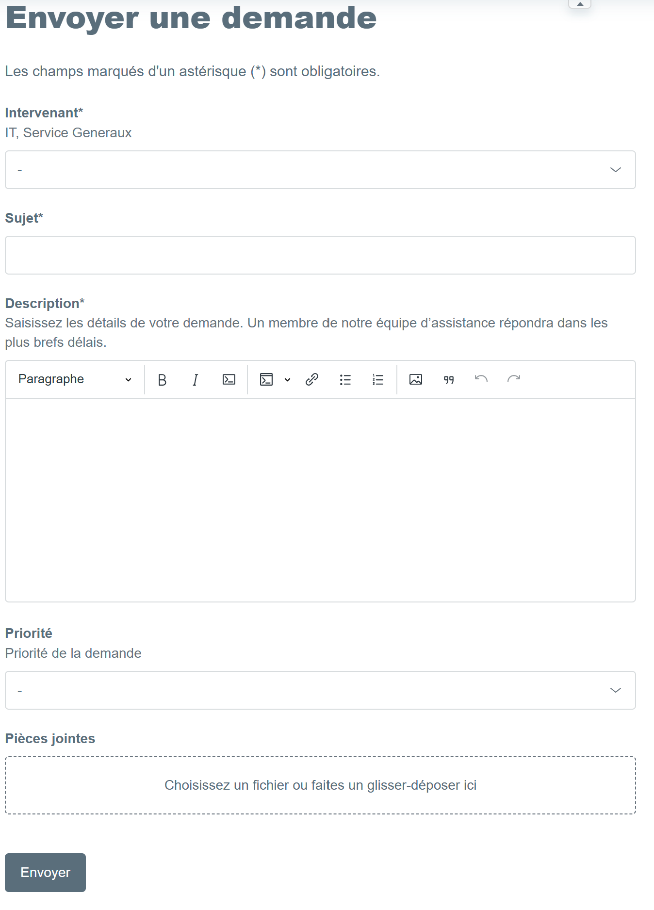Il ne vous restes plus qu'a selectionner le service intervenants : IT ou Services Généraux et de renseigner un titre et une description et une priorité à votre demande (vous pouvez aussi inserer une piece-jointe a votre ticket).