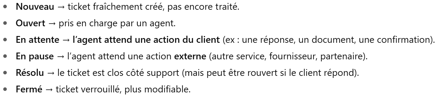 Pour vous aider à suivre vos demandes plus facilement, voici un petit guide des statuts des tickets. Cela vous permettra de savoir exactement où en est votre demande à tout moment :
