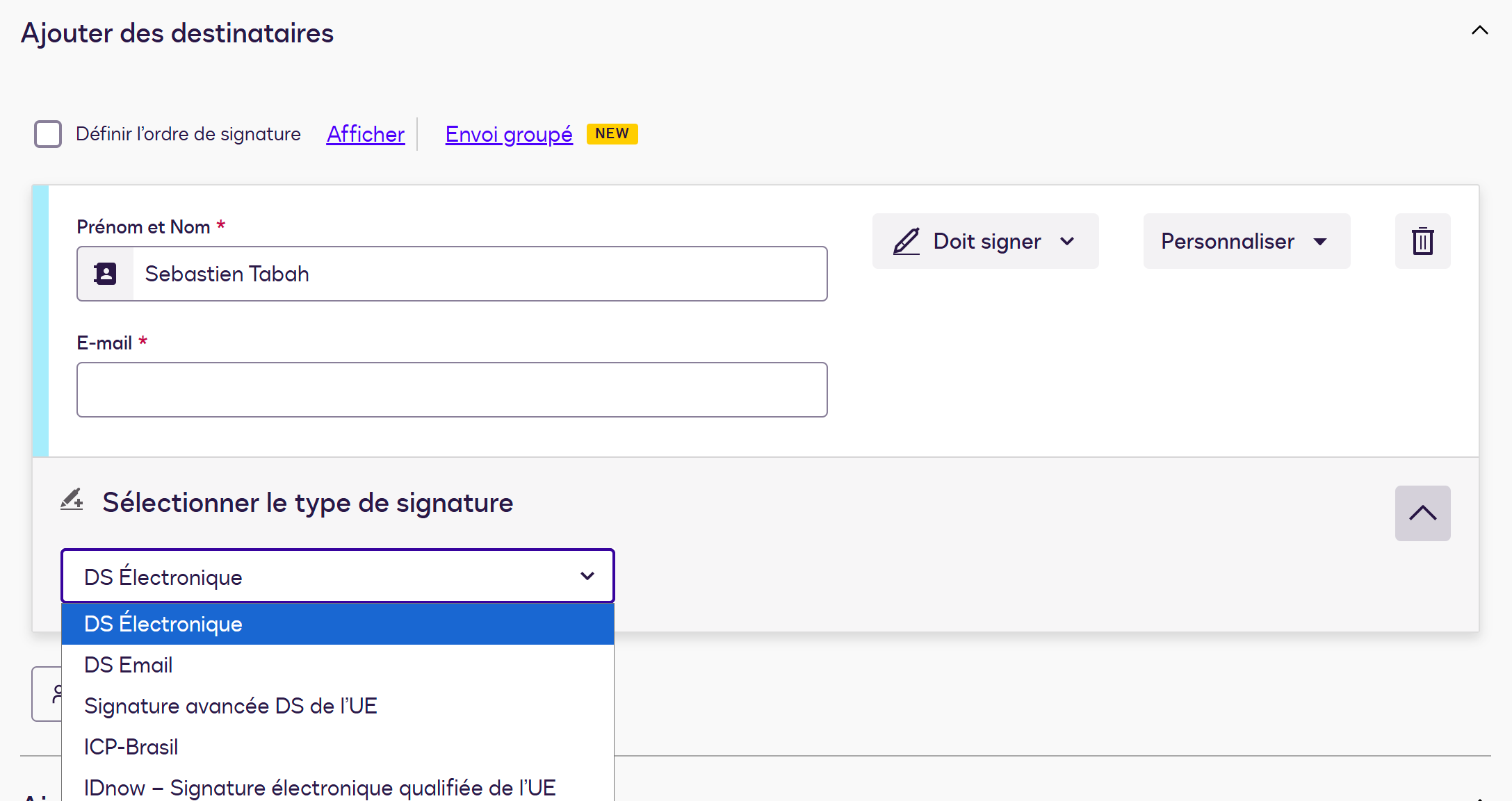 Ici vous allez ajouter les differents intervenants en precisant pour chacun leur action sur le fichier, si le choix est reglé sur 'Doit signer' il faudra chosir dansle menu deroulant le type de signature entre :